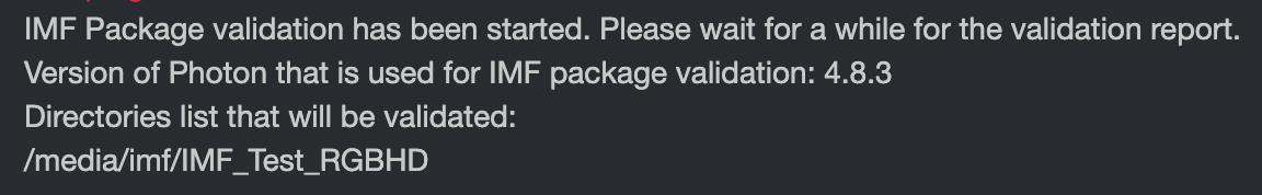 After launching the validate IMF package file action, a new tab will open displaying the packages being validated, as well as the version of the plugin. The process should take about 5 seconds per package. In this example, only one package is being validated: